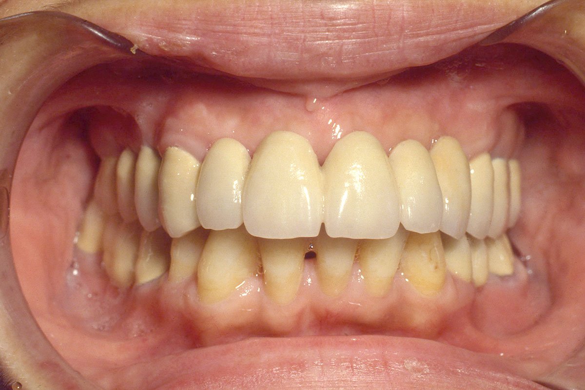 8. Αποκατάσταση άνω και κάτω φραγμού με μεταλλοκεραμικές στεφάνες, μετά από περιοδοντική και ορθοδοντική θεραπεία.