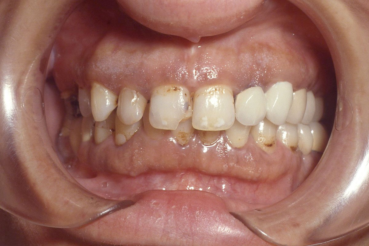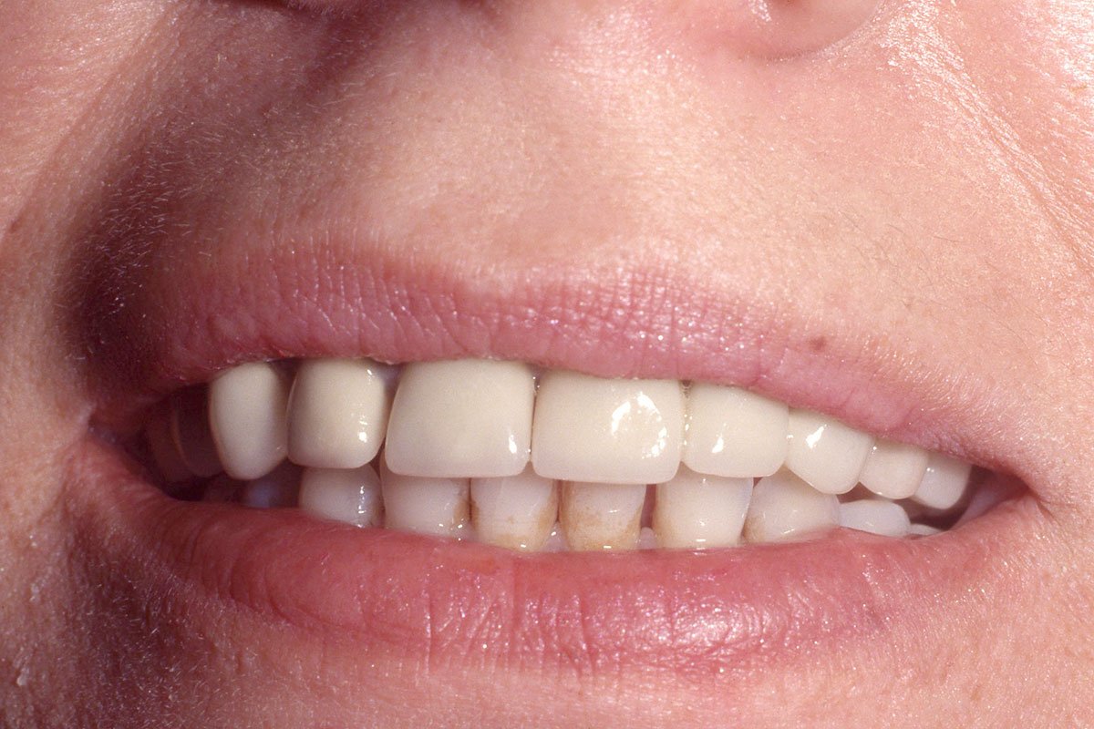 8. Αποκατάσταση άνω και κάτω φραγμού με μεταλλοκεραμικές στεφάνες, μετά από περιοδοντική και ορθοδοντική θεραπεία.